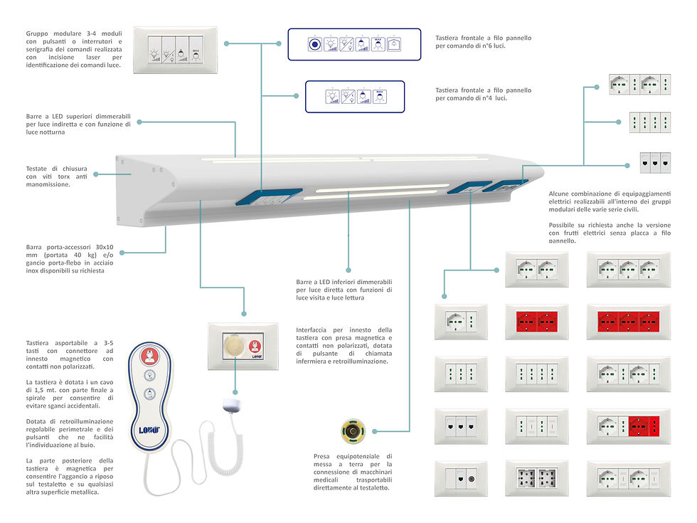 The bedhead beam's load-bearing structure is made from a combination of two extruded aluminum profiles, creating a modern yet functional aesthetic with rounded shapes and an absence of sharp edges. The upper profile encloses, with appropriate divisions and separations, the 230V electrical wiring for powering sockets, buttons, and switches, as well as the low-voltage wiring for data, telephone, LED lighting, call systems, alarms, and diagnostics, the lighting system management board, DIN-rail terminal blocks, and a general ground node. On the outside, the electrical components—supports, plates, call systems, voice, equipotential sockets, and LED lighting systems for examination and reading lights—are located in the oblique part of the upper profile.
